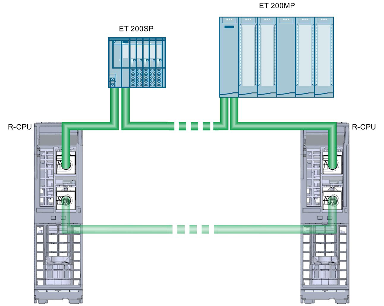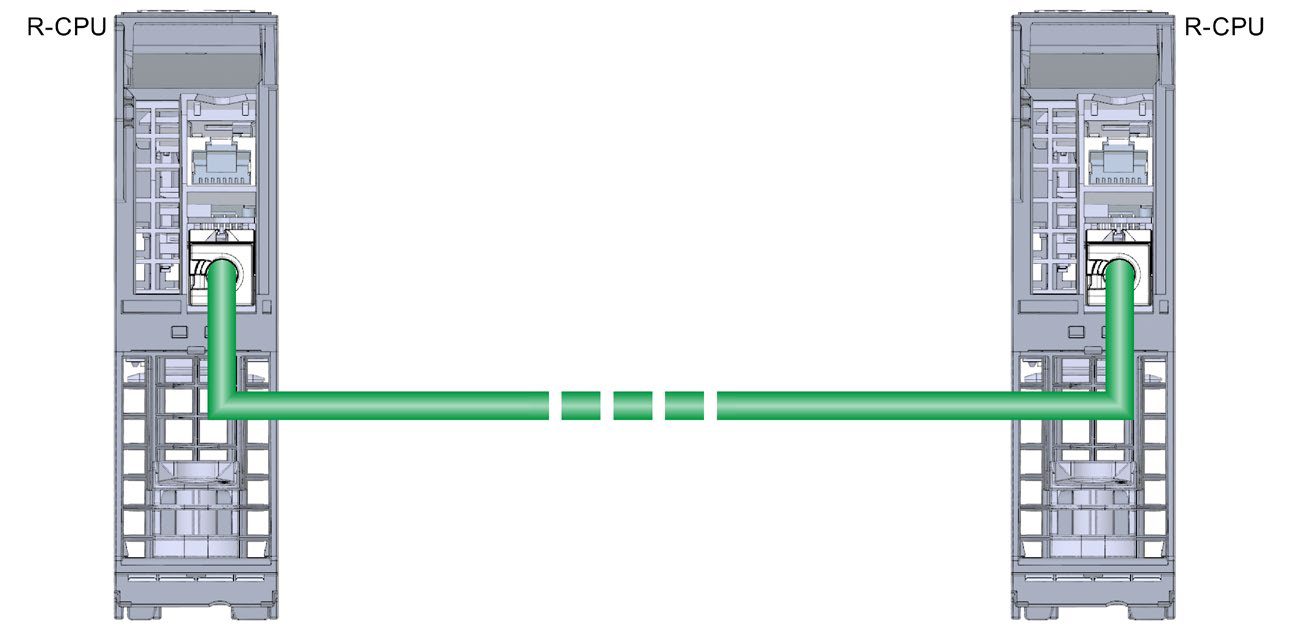 You connect the PROFINET ring between the two R-CPUs at the RJ45 sockets of PROFINET interfaces X1 P1 R and X1 P2 R.