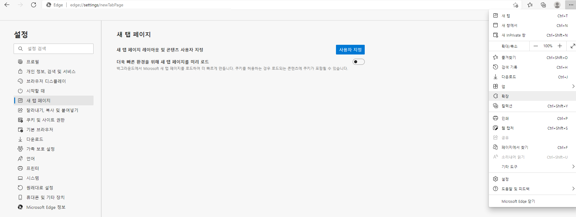 엣지에서 새탭을 눌렀을때 네이버가 뜨게 설정하는 방법
